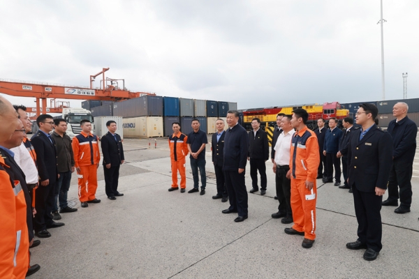 隨后,習(xí)近平來(lái)到重慶鐵路集裝箱中心站,聽(tīng)取貨物集散、運(yùn)輸路徑、運(yùn)營(yíng)成本和效益等介紹,同貨車(chē)司機(jī)、列車(chē)司機(jī)、裝卸工人、場(chǎng)站管理人員等親切交流,詢(xún)問(wèn)他們的工作強(qiáng)度、勞動(dòng)保護(hù)、節(jié)假日休息和收入情況。習(xí)近平說(shuō),大家在物流一線(xiàn),也是在對(duì)外開(kāi)放一線(xiàn),通過(guò)你們的辛勤勞動(dòng),很多商品跨越山海、走向世界,你們的工作很有意義。推動(dòng)西部大開(kāi)放、促進(jìn)西部大開(kāi)發(fā),物流很重要,大家要繼續(xù)努力,不斷創(chuàng)造新的業(yè)績(jī),作出新的貢獻(xiàn)。